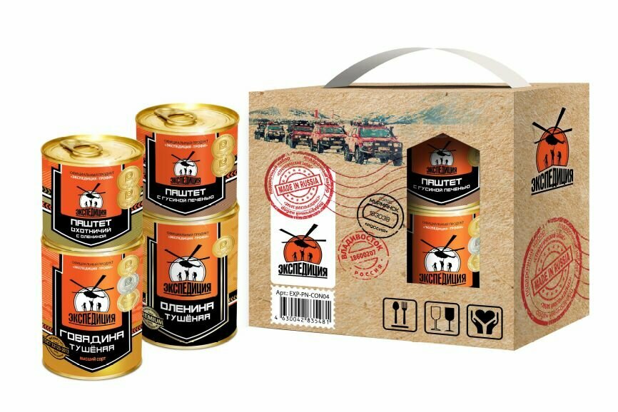 Набор подарочный № 4 Экспедиция" ГОВЯДИНА тушеная. Высший сорт.ГОСТ 338 г. - 1шт ; "Экспедиция" ОЛЕНИНА тушеная. - 1шт; "Экспедиция" Паштет ОХОТНИЧИЙ С ОЛЕНИНОЙ 180 г. - 1шт ; "Экспедиция" Паштет С ГУСИНОЙ ПЕЧЕНЬЮ" 180 г. -1шт.